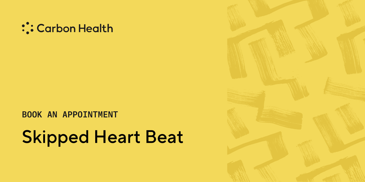 A skipped heartbeat is a palpitation that occurs at an irregular or out-of-pattern rhythm. It happens now and then in healthy individuals, but recurring episodes should be discussed with a nearby Carbon Health. Seek emergency care if your skipped heartbeat is accompanied by chest pains, fever, or disorientation.